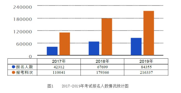 2019年考试报名人数84355人,同比增长24.60%。合计报考科次216337科,同比增长20.61%。2017-2019年考试报名人数与报名科次持续增长。