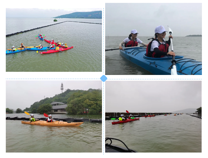 活动开始前,由教练员进行岸上教学及安全注意事项,随后在几位教练员的看护下依次上船下水,有的两两搭档开始适应水上环境和协调划艇,有的单枪匹马预备乘风破浪。大家在教练的精心指导下掌握了基本要领小练了一公里左右。由三位教练直接带入更远的湖区,同时还有冲风艇为我们保驾护航,我们由刚开始的忐忑不安到后来划得得心应手,在被湖浪推波逐流中感受到了皮划艇带给我们的快乐与激情。随后我们派出4条双龙两两一组和4条单艇也是两两一组开展充满挑战、极具趣味的水上皮划艇拔河比赛活动。湖面上充满了“一二一二加油的口号声”,岸边的队员齐呼呐喊“加油加油”,第一组双龙比赛两决两胜无悬念产生,第二组单艇比赛竞然出现了女单男单战胜了2男单的局面,整场拔河比赛把团建活动掀起了最高潮,这不仅是力量的较量,也是划艇技巧的展示。
