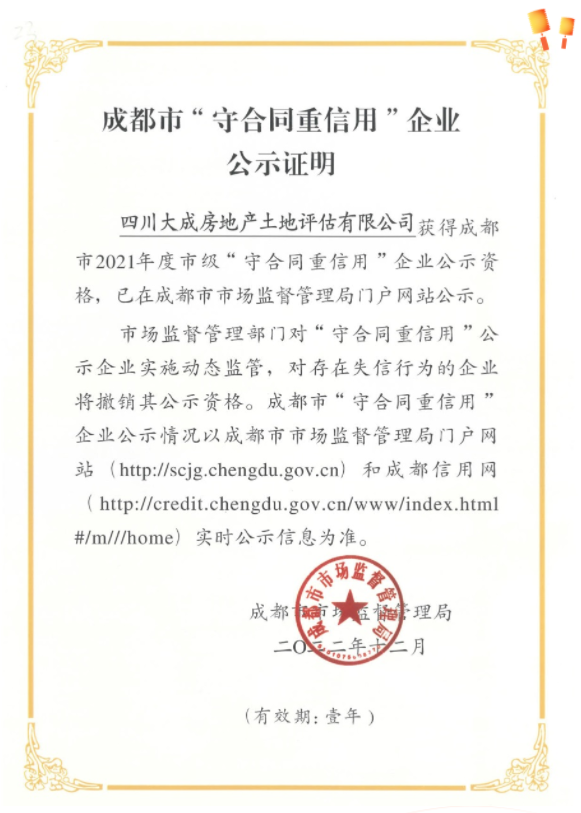 四川大成评估连续三年被评为成都市“守合同重信用”企业,这是主管部门与社会各界对公司的认可。一直以来,公司高度重视企业信用管理密切相关,坚持诚信守法经营,努力开展信用体系建设,持续提升内部管理水平。今后,公司将进一步提高合规意识、推进企业诚信建设。