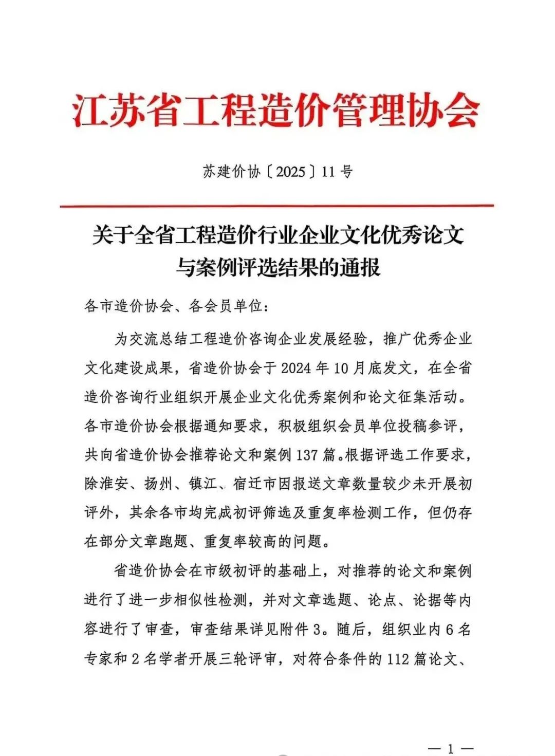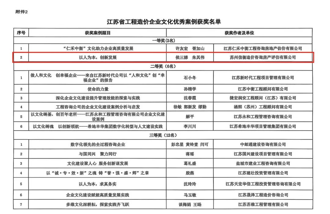 近日,江苏省工程造价管理协会发布《关于全省工程造价行业企业文化优秀论文与案例评选结果的通报》,由信衡总经理侯三娣与办公室主任朱其伟共同创作的文章《以人为本,创新发展》,获评“江苏省工程造价企业文化优秀案例一等奖”。