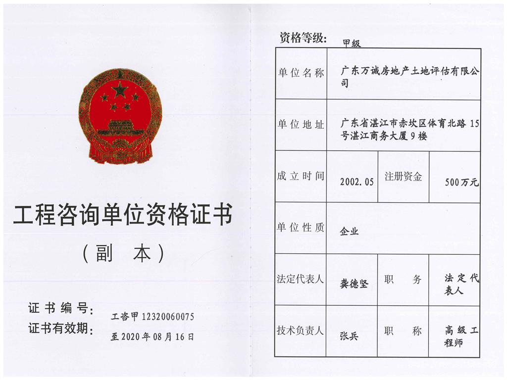 广东万诚房地产土地评估有限公司、广东万诚工程造价咨询有限公司成立于2002年5月,经过多年的创业,发展迅速,目前拥有房地产评估、土地评估、工程咨询、工程招标代理、工程造价咨询和政府采购代理等多项资质,从而使我司具备了综合执业的资格。