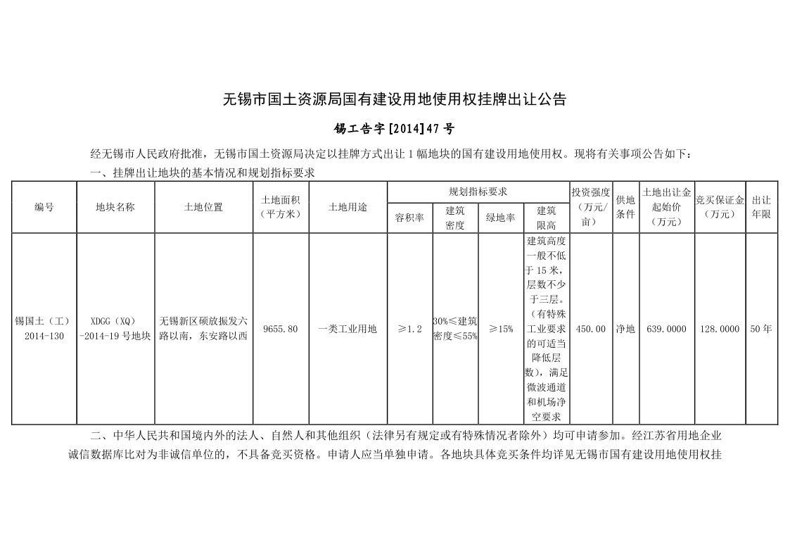 无锡市国土资源局国有建设用地使用权挂牌出让公告锡工告字[2014]47 号