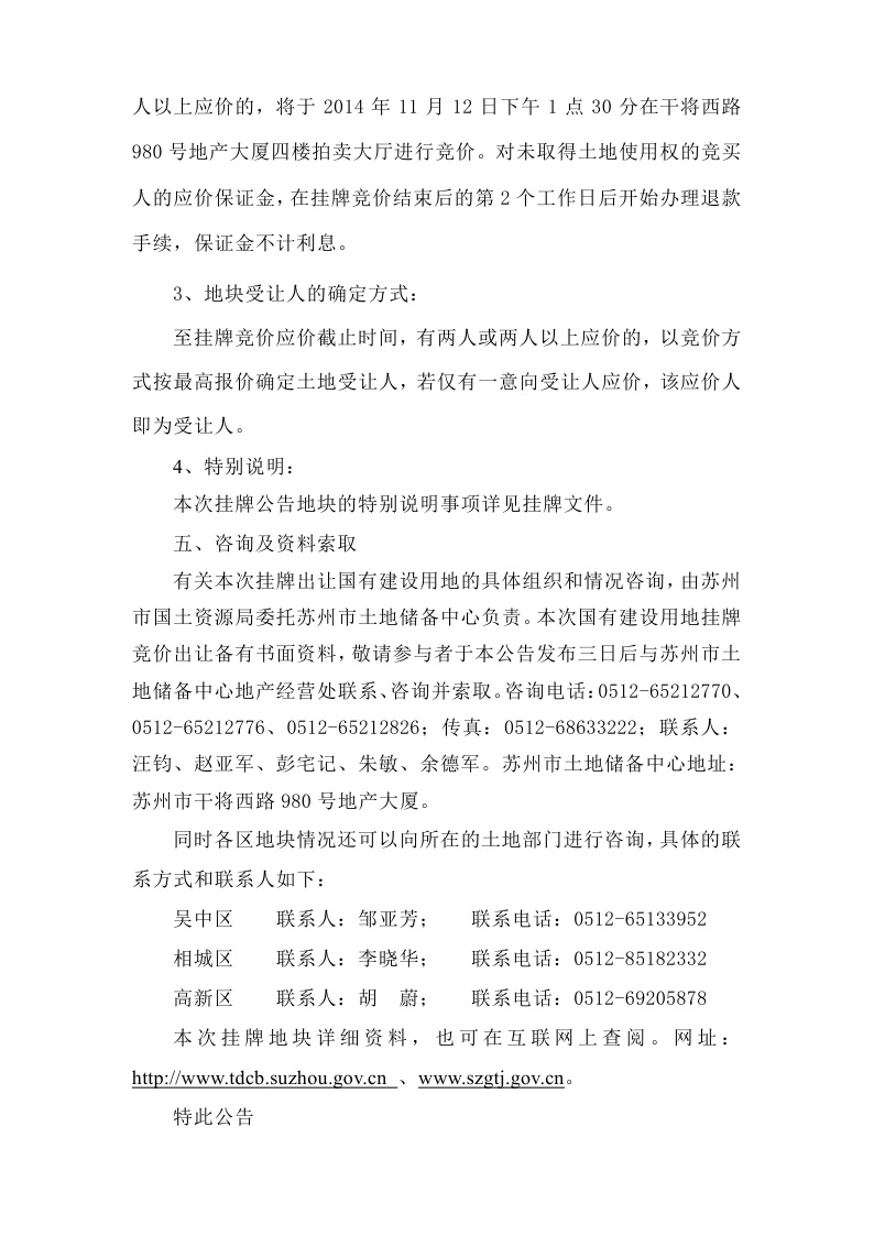 苏州市国土资源局国有建设用地使用权挂牌出让公告 2014年经营性用地第3号
