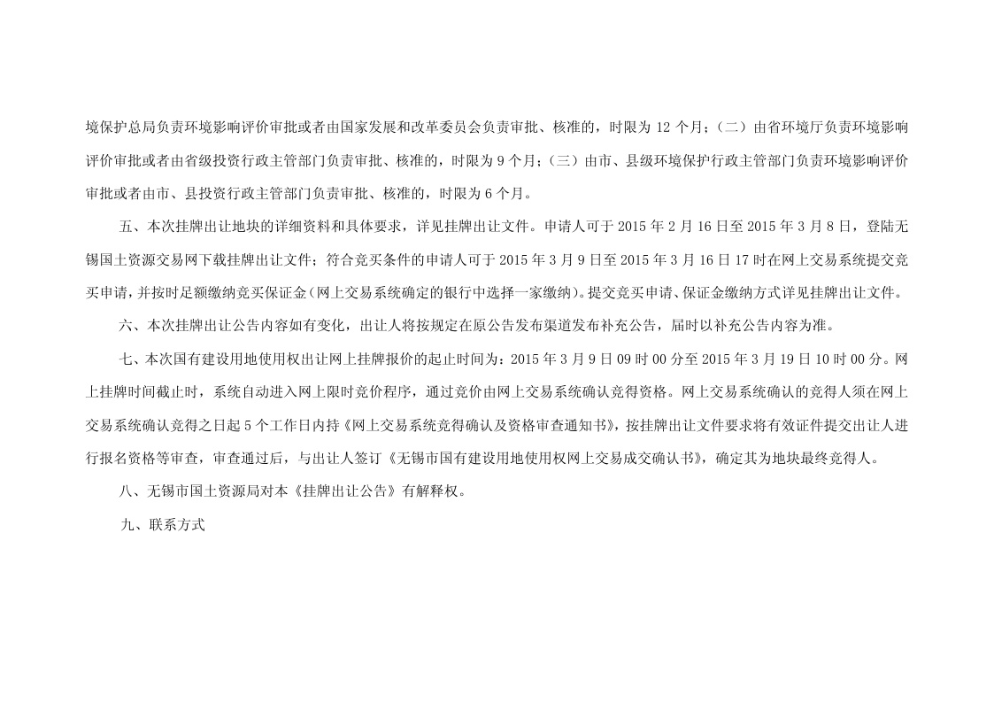 无锡市国土资源局国有建设用地使用权挂牌出让公告锡工告字[2015]07号
