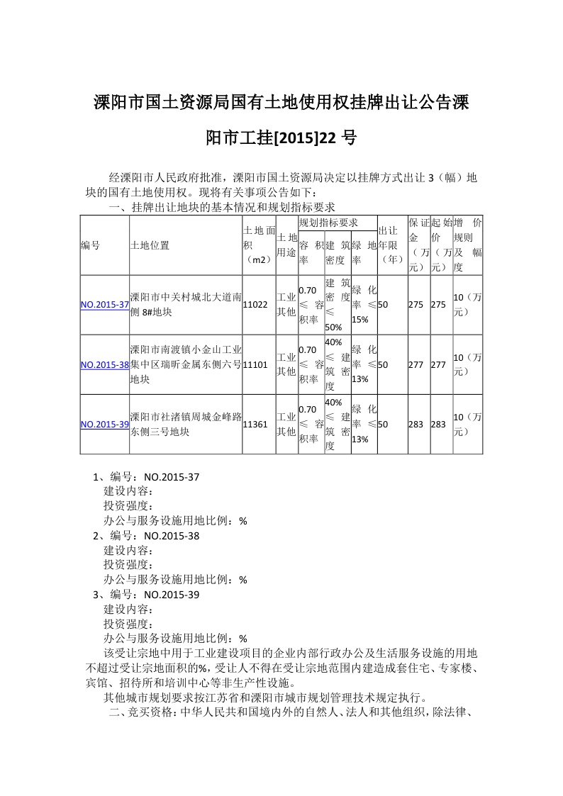 溧阳市国土资源局国有土地使用权挂牌出让公告溧阳市工挂[2015]22号