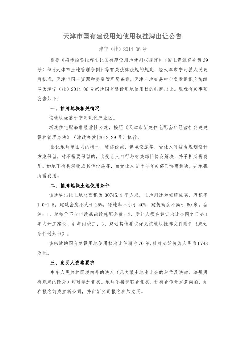天津市国有建设用地使用权挂牌出让公告 津宁(挂)2014-06号