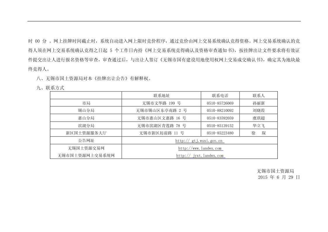 无锡市国土资源局国有建设用地使用权挂牌出让公告 锡工告字 [2015]26 号