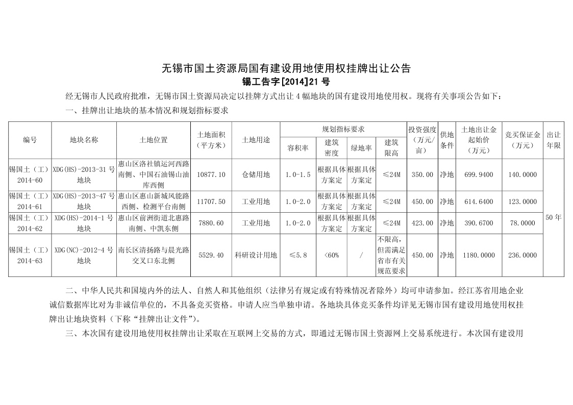 无锡市国土资源局国有建设用地使用权挂牌出让公告 锡工告字[2014]21 号
