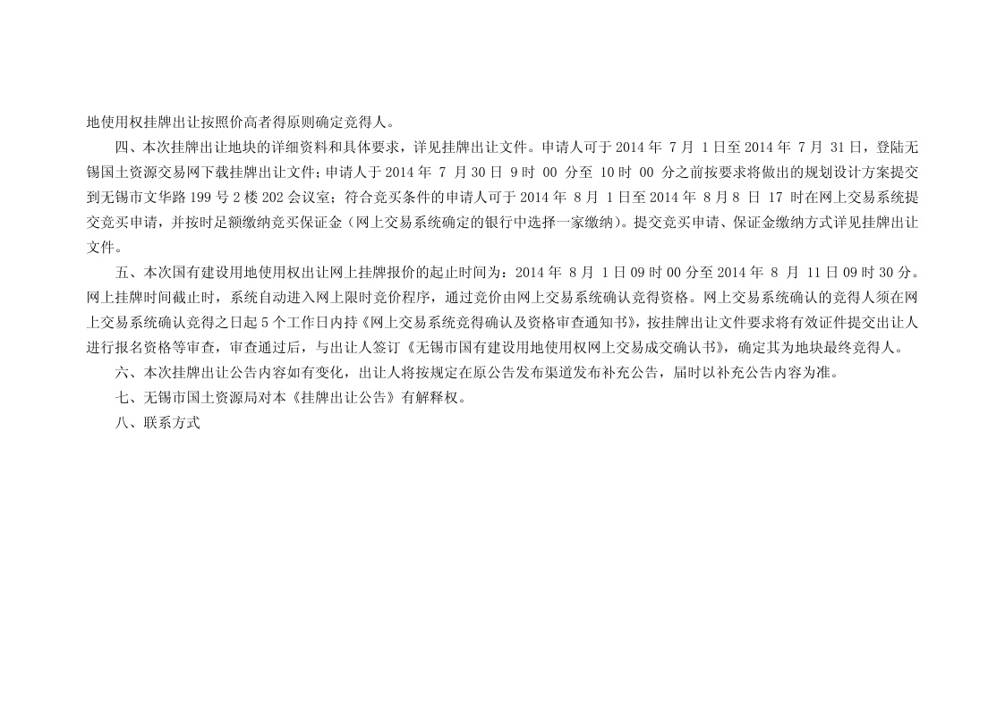 无锡市国土资源局国有建设用地使用权挂牌出让公告锡经告字[2014]16号