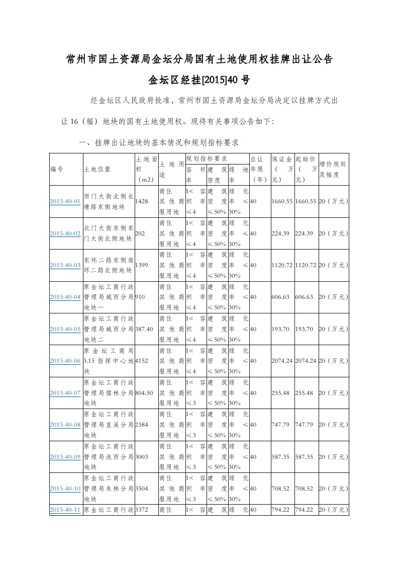 常州市国土资源局金坛分局国有土地使用权挂牌出让公告 金坛区经挂[2015]40号