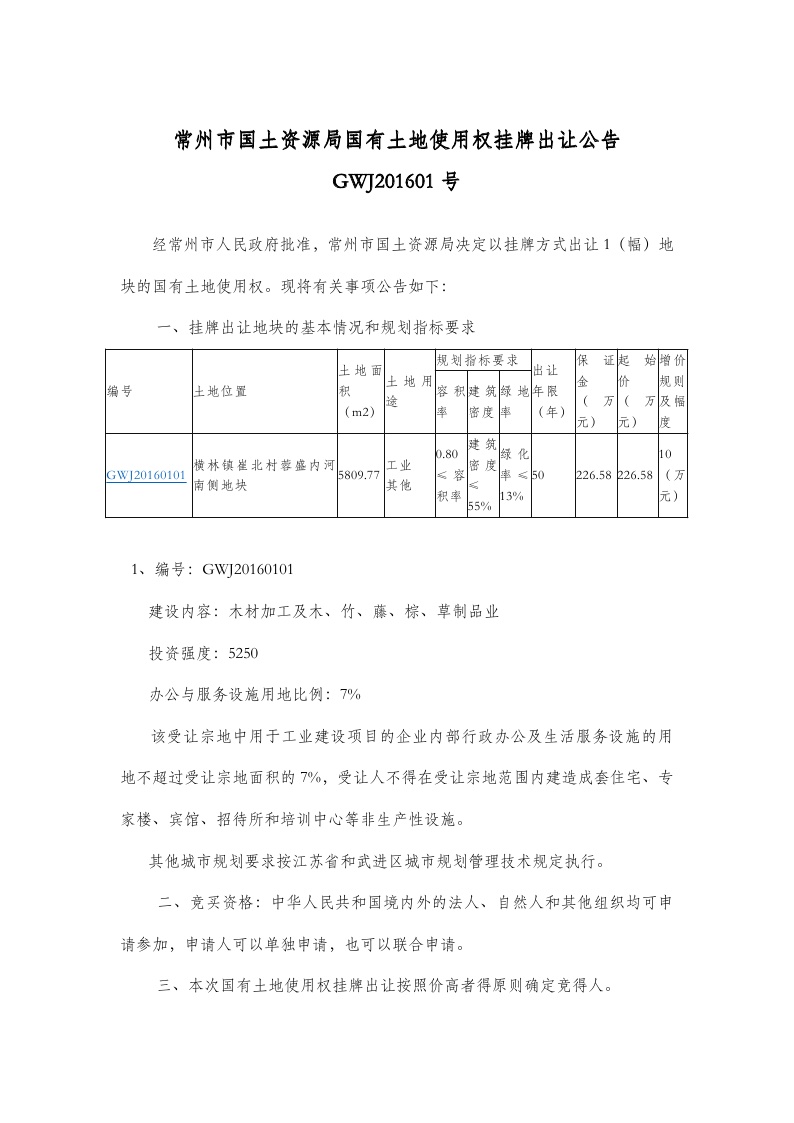常州市国土资源局国有土地使用权挂牌出让公告 GWJ201601号